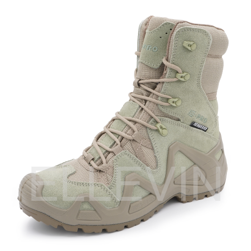 Серия обуви E-PRO — это одна из самых популярных в туристической и тактической обуви, используемая походниками, альпинистами, спортсменами, военными и сотрудниками правоохранительных органов. Линейка E-PRO Special представлена целым семейством моделей, отличающихся по цвету, высотой берца, а также наличием мембраны. Основной материал изготовления — высококачественная замша со вставками из кордуры. Наличие подкладки из мембраны делает обувь непромокаемой и одновременно дышащей, способной отводить испарения с поверхности стопы. Подлитой носок обеспечивает защиту от повреждений. Защитный рант с выборками для облегчения веса проходит по всему периметру и создает узнаваемый образ. Кроме основных функций рант дает дополнительное сцепление с поверхностью, например, при движении вдоль склона. Высота среднего ботинка 14.5 см, этого хватает для отличной фиксации голеностопа. Все детали прошиты двойным швом, все швы сделаны крайне аккуратно. На пятке есть петелька, облегчающая надевание. Подошва имеет многослойную структуру. Промежуточный слой из полиуретана придает высокие амортизирующие свойства; ходовой слой из резины на основе натурального каучука делает подошву более износостойкой и способствует хорошему сцеплению с грунтом и другими плоскостями. Язычок с защитным клапаном исключает просачивание воды и попадание посторонних предметов внутрь.