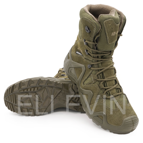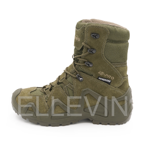 Серия обуви E-PRO — это одна из самых популярных в туристической и тактической обуви, используемая походниками, альпинистами, спортсменами, военными и сотрудниками правоохранительных органов. Линейка E-PRO Special представлена целым семейством моделей, отличающихся по цвету, высотой берца, а также наличием мембраны. Основной материал изготовления — высококачественная замша со вставками из кордуры. Наличие подкладки из мембраны делает обувь непромокаемой и одновременно дышащей, способной отводить испарения с поверхности стопы. Подлитой носок обеспечивает защиту от повреждений. Защитный рант с выборками для облегчения веса проходит по всему периметру и создает узнаваемый образ. Кроме основных функций рант дает дополнительное сцепление с поверхностью, например, при движении вдоль склона. Высота среднего ботинка 14.5 см, этого хватает для отличной фиксации голеностопа. Все детали прошиты двойным швом, все швы сделаны крайне аккуратно. На пятке есть петелька, облегчающая надевание. Подошва имеет многослойную структуру. Промежуточный слой из полиуретана придает высокие амортизирующие свойства; ходовой слой из резины на основе натурального каучука делает подошву более износостойкой и способствует хорошему сцеплению с грунтом и другими плоскостями. Язычок с защитным клапаном исключает просачивание воды и попадание посторонних предметов внутрь.