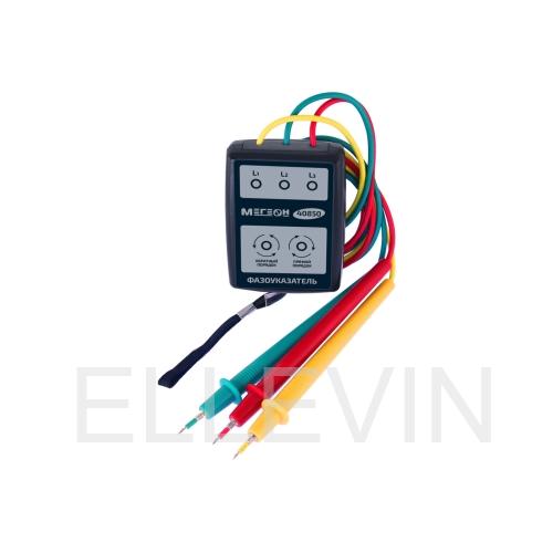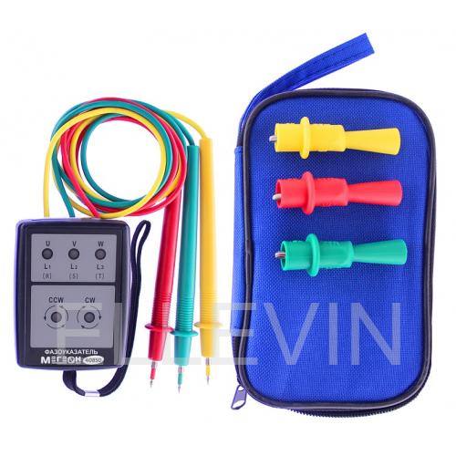 Порядок чередования фаз или полное отсутствие фазы отображается с помощью светодиодов на фронтальной панели прибора и встроенного зуммера. Комплект поставки включает в себя измерительные щупы типа "крокодил", которые существенное упрощают работу с фазоуказателем Мегеон 40850.