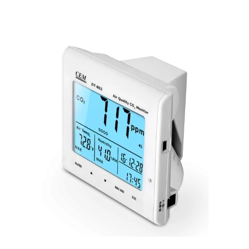 Измеритель DT-802 предназначен для контроля качества воздуха, в том числе отделами охраны здоровья, путем измерения уровня концентрации СО2 в воздухе, например, на предприятиях, в школах, офисах, на транспортных магистралях и т.д. Измеренное значение выражается в ppm (частиц на млн.) и отображается на ЖК-экране прибора с сопровождающим индикатором качества воздуха: Нормальный (0-800 ppm), Удовлетворительный (800-1200 ppm), Загрязненный (свыше 1200 ppm). В случае превышения допустимой нормы содержания СО2 прибор выдает звуковой сигнал.