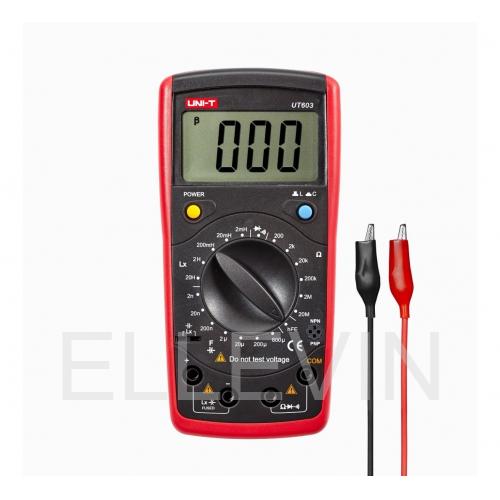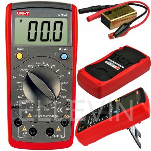 Мультиметр UNI-T UT603 привлекает внимание компактными габаритами, удобным для удержания в руках дизайном и ярко-красной расцветкой. Измерения осуществляются в пределах 200 Ом – 20000 кОм сопротивления при погрешности 0.8% или 1 единицы, а также 2 нф – 600 мкф емкости при погрешности 1% или 5 единиц. Прибор питается от батареи 9 B, включенной в комплект вместе с зажимами «крокодил». Модель UNI-T UT603 предназначается для измерения сопротивления и емкости электрической цепи. Также допускается проверка диодов, целостности и индуктивности. Удобный ручной тестер весит 312 грамм, имеет габариты 8.3x17.2x3.8 см и дополняется удобными звуковыми сигналами, функцией автоотключения и подсветкой дисплея. Оптимальная работа осуществляется в пределах температурного режима от 0 до +40 градусов и 0-75% влажности.