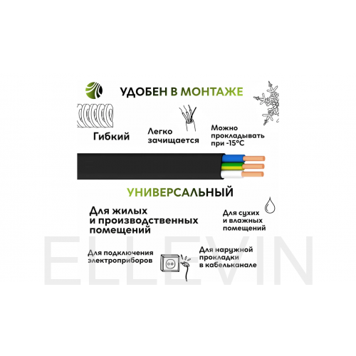 Укладка кабеля возможна под штукатурку, поверх штукатурки, в кирпичной кладке и в бетоне. Кабель не распространяет горение при групповой прокладке. Монтаж кабеля возможен при температуре до -15 градусов. Хранение кабеля при минусовых температурах не рекомендуется.