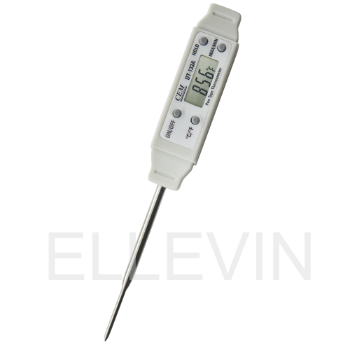 Влагозащищенный цифровой термометр модели DT-133A ПОРЯДОК РАБОТЫ Для работы с термометром необходимо снять защитный чехол, нажать кнопку «ON/OFF» (Вкл. /Выкл.) и поместить щуп (не менее, чем наполовину своей длины) в измеряемую среду. На экране отображается текущее значение температуры среды измерения. Для увеличения реального срока службы батареи термометр автоматически выключается примерно через 45 минут. Переключение между единицами измерения температуры °C to °F Единицу измерения температуры можно изменить с °C на °F нажатием кнопки °C / °F. Фиксация показаний текущей температуры «Hold» В стандартном режиме работы нажать кнопку «Hold». Для перехода в режим работы нажать ещё раз кнопку «Hold». Отображение максимального/минимального значения температур Для отображения максимального значения температуры в стандартном режиме нажать кнопку «МАХ/MIN». На экране включится индикатор «МАХ». Для вывода показания минимальной температуры снова нажать указанную кнопку. На экране включится индикатор «MIN». Повторно нажать указанную кнопку для перехода в нормальный режим работы.