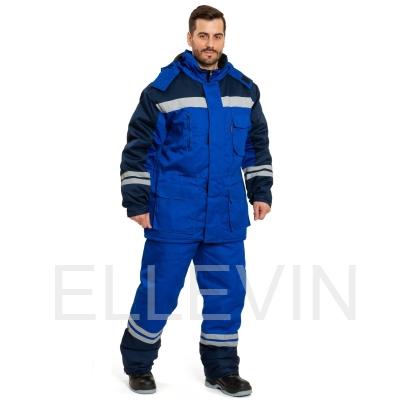 Состоит из куртки и брюк. Куртка прямая, с застежкой на пуговицы, с двумя нижними и одним верхним накладными карманами. Кокетка куртки выполнена из контрастной ткани. Рукава с защитными накладками в области локтей. Брюки с передними карманами и защитными накладками в области колен.
