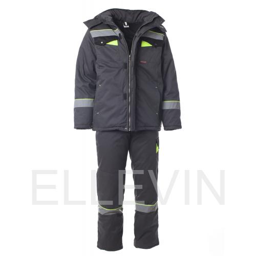 ТКАНЬ ВЕРХА: «Орион-2» смесовая с водоотталкивающей отделкой (65% ПЭ, 35% ХБ, пл. 200±10 гр./м², ВО отделка). УТЕПЛИТЕЛЬ: Полотно высокоизвилистое, силиконизированное «Аляска»-150 гр./м² в куртке 3 слоя, в полукомбинезоне 2 слоя.