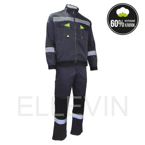 Костюм из ткани с масловодоотталкивающей отделкой, малоусадочной, дышащей, износостойкой. Изделия из этой ткани подходят для стирки и химчистки на профессиональном оборудовании, что подтверждено протоколом испытаний. Костюм с контрастной отсрочкой, с застежкой на закрытую молнию. Молния пластиковая, повышенной прочности, с металлическим бегунком, «мелкий зуб», цвет «серебро». Нагрудные карманы с накладными комбинированными нагрудными карманами и фигурными клапанами на кнопках с пластиковой шляпкой. Нижние карманы в рельефных швах полочек. Рукава с локтевым швом и манжетами на кнопках. Брюки с поясом и шлевками с эластичной резинкой, с 5-ю многофункциональными карманами. Застёжка гульфика на молнию. Анатомические наколенники объёмные с вытачками, с подрезом под коленом. В костюме присутствует световозвращающая лента шириной 50 мм (400кд) и декоративные элементы лимонного цвета.