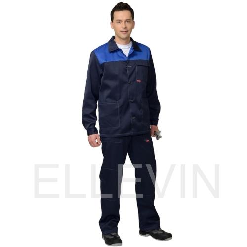 Состоит из куртки и брюк. Куртка прямая, с застежкой на пуговицы, с двумя нижними и одним верхним накладными карманами. Кокетка куртки выполнена из контрастной ткани. Рукава с защитными накладками в области локтей. Брюки с передними карманами и защитными накладками в области колен.