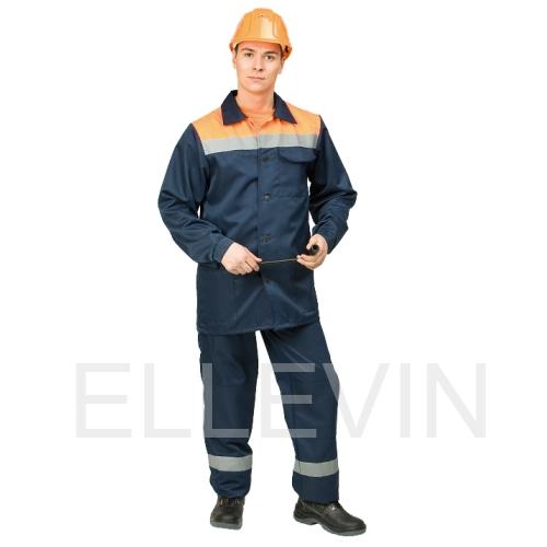 Состоит из куртки и брюк. Куртка с застежкой на пуговицы. На костюме усиление в области локтей и коленей, световозвращающие полосы.