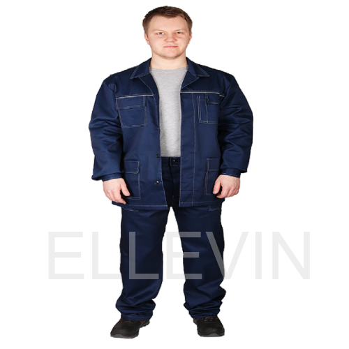 Состоит из куртки и брюк. Куртка прямая, с застежкой на пуговицы, с двумя нижними и нагрудным накладными карманами. На груди и спине светоотражающий кант. Брюки с передними накладными карманами.