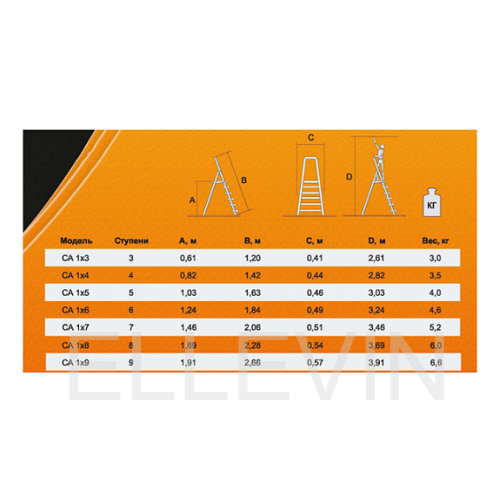 Корпус изготовлен из алюминия, что облегчает транспортировку. Односекционная модель с 7-ю широкими ступенями с рифленой поверхностью и рабочей площадкой. Чтобы стремянка не скользила, на опорах оборудованы заглушки. Также есть дуга безопасности. В сложенном состоянии модель очень компактна и занимает мало места.