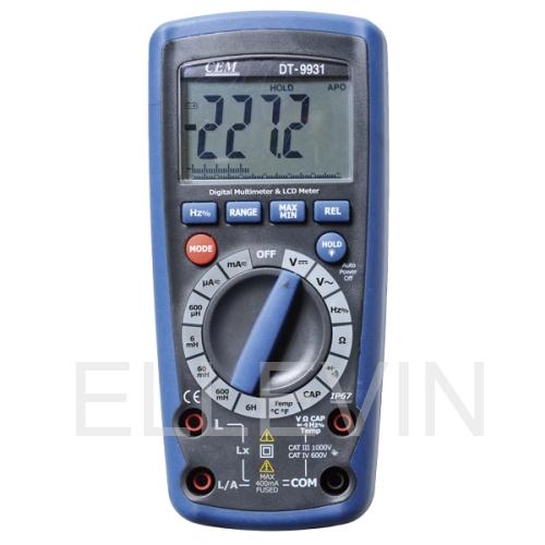 DT-9931 – профессиональный мультиметр с LCR-метром с автоматическим выбором диапазона измерений. Особенности DT-9931 Защита от перегрузок IEC 1010-1 CATIV 600V, CATIII 1000V Защита на всех диапазонах Удержание показаний DATA HOLD Определение максимальных и минимальных значений MAX/MIN Относительные измерения REL Автовыбор диапазона Автовыключение Диодный тест и прозвонка цепей Степень защиты IP 67 Бесконтактный детектор напряжения Автоматический и ручной выбор диапазона измерения Графическая шкала