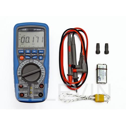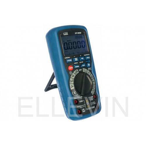 DT-9959 измеряет переменное и постоянное напряжение, переменный и постоянный ток, сопротивление, емкость, частоту (электрическую и электронную), коэффициент заполнения, выполняет контроль исправности диодов, проверку цепи на отсутствие обрыва, измерение температуры с помощью датчика-термопары. Прибор способен записывать и воспроизводить записанные данные на экран, имеет прочный корпус с защитой от проникновения влаги, предназначен для профессионального использования. Мультиметр может передавать данные по беспроводному каналу связи на ПК.