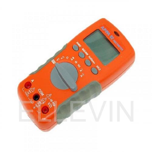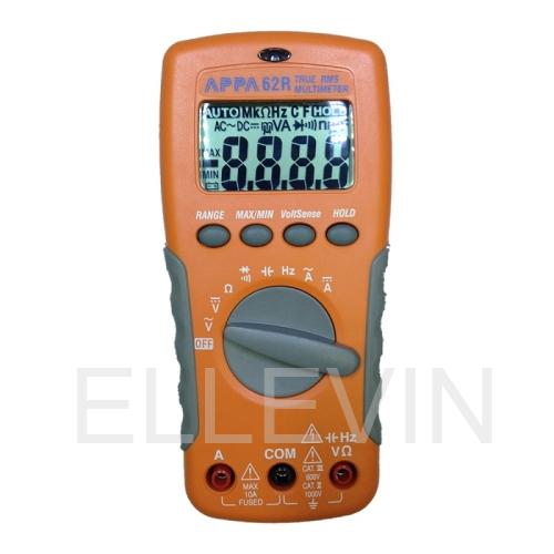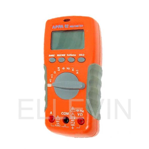 Мультиметр цифровой APPA 62R (APPA Technology Corporation): Постоянное напряжение 200 мВ - 1000 В; Переменное напряжение 2 мВ - 750 В; Постоянный ток 1 мА - 10 А; Переменный ток 1 мкА - 10 А; Сопротивление 0,1 Ом - 20 МОм; Прозвон цепи; Испытание p-n; Ёмкость 2 нФ - 2 мФ; Частота 2 кГц - 40 МГц; Удержание показаний; Регистрация min/max; Автоотключение с блокировкой; Дисплей 3 (2000); Противоударное исполнение; Бесконтактное определение наличия высокого напряжения.