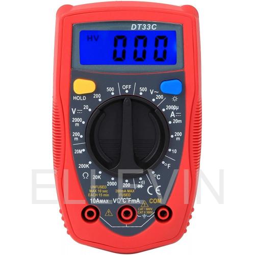 Портативный безопасный цифровой мультиметр DT33C с ЖК дисплеем, имеющий разрешение 3 ½ разряда, который предназначен для измерения постоянного и переменного напряжения, постоянного и переменного тока, сопротивления, температуры, тестирования транзисторов, а также прозвона цепи на обрыв
