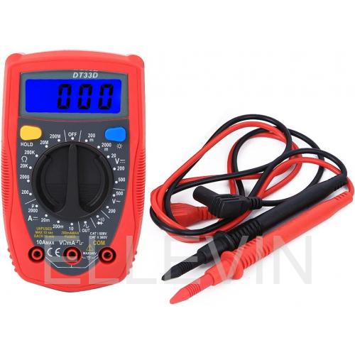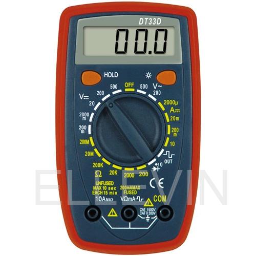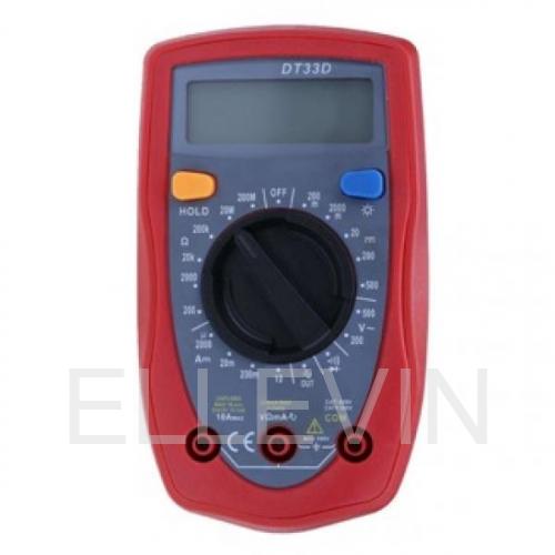 Цифровой мультиметр DT33D предназначен для измерений постоянного и переменного напряжения, постоянного тока, сопротивления, тестирования диодов, транзисторов и прозвона цепей.Имеет удобный поворотный переключатель, который используется для выбора функций и диапазона, а также для включения и выключения прибора.