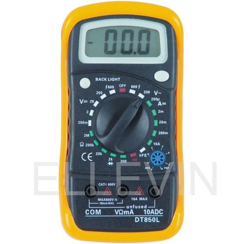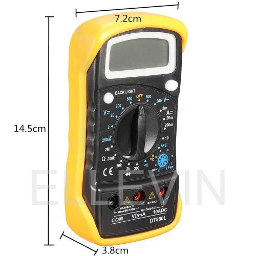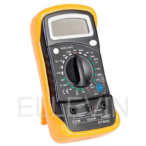 Цифровой мультиметр DT850L – это небольшой цифровой мультиметр, который удобно брать с собой в поездки или рабочие выезды. В комплекте с аппаратом поставляются фирменные щупы с наконечниками. Основа корпуса мультиметра выполнена в черном цвете, задняя крышка прибора желтая. Прибор оснащен подсветкой дисплея.