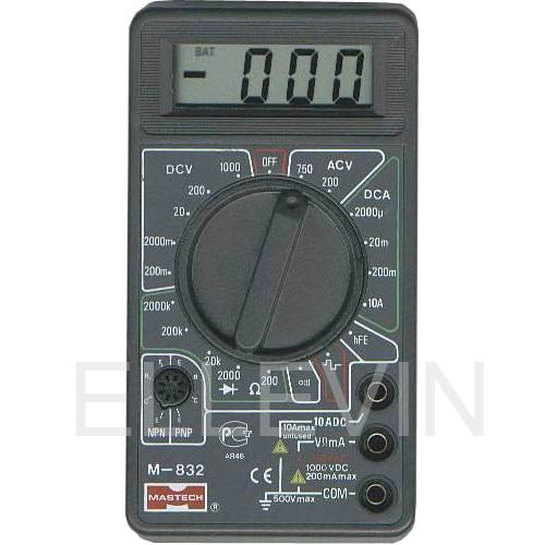 Портативный мультиметр M832 служит для измерения постоянного и переменного напряжения, постоянного тока, сопротивления, а также для проверки полупроводниковых диодов и прозвонки электрических цепей. Интуитивно понятное управление делает использование аппарата простым и доступным. Отличительной особенностью модели является функция генерирования прямоугольных сигналов (меандр), эта функция нужна для измерений и преобразований сигнала.