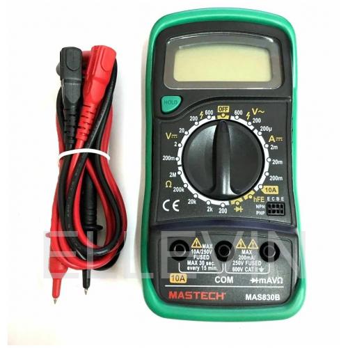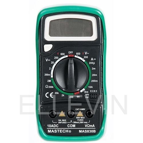 Цифровой мультиметр Mastech MAS830B предназначен для измерения постоянного/переменного напряжения, постоянного тока, сопротивления, коэффициента усиления транзисторов. Имеется диод-тест. Функция DATA HOLD позволяет фиксировать только что измеренное значение на дисплее. Разрядность дисплея составляет 2000 отсчетов. Прибор совершает 2-3 измерения в секунду. Модель работает от 1 батарейки 9 В типа "Крона". Данная информация скопирована со страницы: