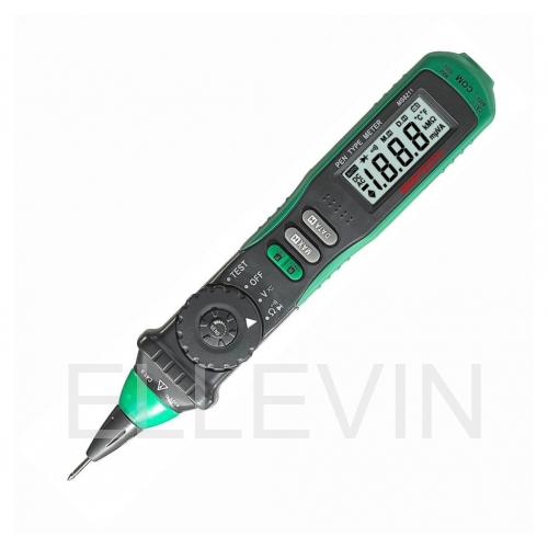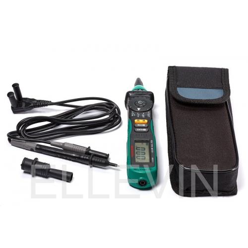 Карманный цифровой мультиметр Mastech MS8211 c бесконтактным пробником переменного напряжения выполнен в виде авторучки. Он полностью соответствует международному стандарту IEC1010-1 Standart CAT II 600V. Выбор диапазонов измерения производится автоматически и в ручную. С помощью мультиметра MS8111 можно производить измерения величин постоянного и переменного напряжения и сопротивления. В приборе применена защита от перегрузки с помощью самовосстанавливающегося предохранителя. С помощью цифрового мультиметра MS8211 также можно проверять полупроводниковые диоды, прозванивать электрические цепи, а так же бесконтактным способом определять наличие переменного напряжения. Полученные результаты можно зафиксировать с помощью функции DATA HOLD. Питание мультиметра осуществляется от двух батарей 1,5В типа АА.
