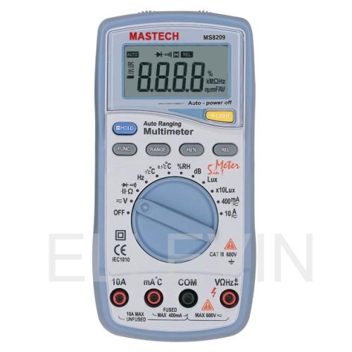 Профессиональный мультиметр MS8209 с автовыбором диапазонов. Революционный по своим возможностям цифровой мультиметр объединяет в себе сразу пять измерительных приборов с отличными характеристиками. Помимо основных функций мультиметра (измерения величин силы постоянного и переменного тока, постоянного и переменного напряжения, сопротивления), MS8209 позволяет измерять температуру, влажность, уровень звукового поля и уровень внешней освещенности. С помощью цифрового мультиметра MS8229 можно тестировать полупроводниковые диоды и прозванивать электрические цепи.