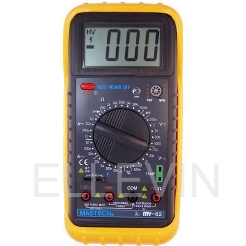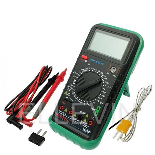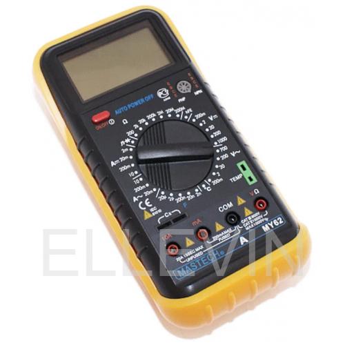 Цифровой мультиметр Mastech MY62 измеряет величины силы постоянного и переменного тока, постоянного и переменного напряжения. сопротивления, коэффициента усиления биполярных транзисторов, температуры и ёмкости конденсаторов. Высокое входное сопротивление не вносит погрешности при измерениях величин и говорит о высокой точности прибора. Выбор пределов измерения величин производится вручную путем установки нужного положения многопозиционного переключателя.