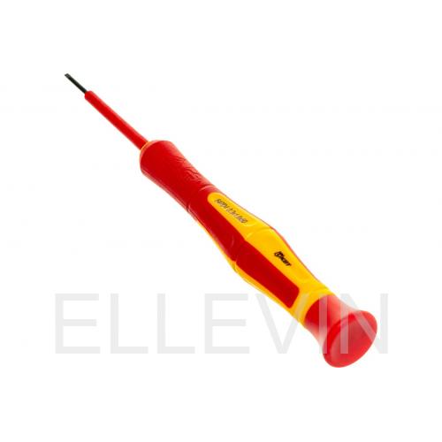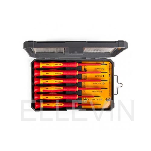 Каждая отвертка прошла индивидуальное тестирование напряжением 10 кВ согласно DIN 60900 Материал стержня: хром-молибденовая сталь Вороненые намагниченные наконечники Анатомическая двухкомпонентная рукоятка с вращающейся насадкой На каждой отвертке — маркировка типоразмера Эргономичный дизайн рукояток Вставки из мягкого прорезиненного материала предотвращают соскальзывание при работе Упаковка: пластиковый кейс