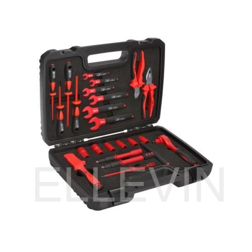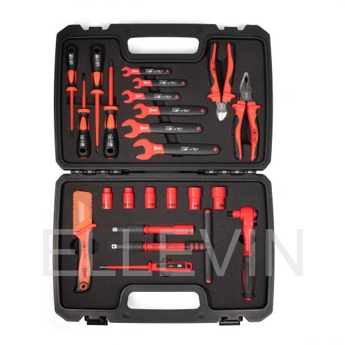 1) диэлектр. трещоточный ключ 200 мм 2) диэлектр. Т-образная рукоятка 200 мм 3) диэлектр. удлинитель 150 мм 4) диэлектр. шестигранная головка 3/8’’ – 8 мм 5) диэлектр. шестигранная головка 3/8’’ – 10 мм 6) диэлектр. шестигранная головка 3/8’’ – 12 мм 7) диэлектр. шестигранная головка 3/8’’ – 13 мм 8) диэлектр. шестигранная головка 3/8’’ – 17 мм 9) диэлектр. шестигранная головка 3/8’’ – 19 мм 10) диэлектр. однорожковый ключ 8 мм 11) диэлектр. однорожковый ключ 10 мм 12) диэлектр. однорожковый ключ 12 мм 13) диэлектр. однорожковый ключ 13 мм 14) диэлектр. однорожковый ключ 17 мм 15) диэлектр. однорожковый ключ 19 мм 16) диэлектр. нож монтерский НМИ-05 17) диэлектр. пассатижи 180 мм 18) диэлектр. бокорезы 160 мм 19) диэлектр. отвертка: шлиц 4х100 20) диэлектр. отвертка: шлиц 5.5х125 21) диэлектр. отвертка: PH1x80 22) диэлектр. отвертка: PH2x100 23) отвертка-индикатор