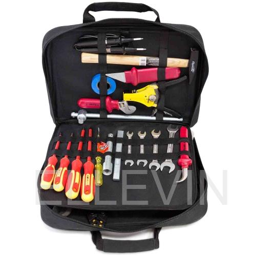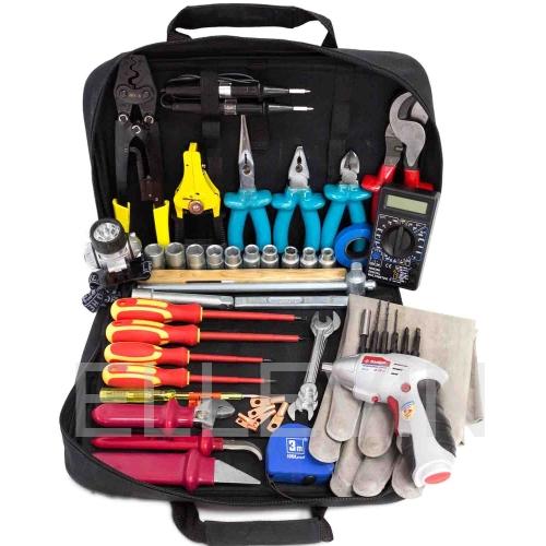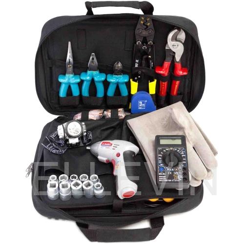 Данный набор инструментов включает в себя диэлектрические отвертки, плоскогубцы, кусачки, длинногубцы, кабелерез. Имеется возможность менять присоединительные клеммы на оборудовании, а наличие аккумуляторной отвертки с насадками позволяет ускорить сборочно-монтажный процесс.