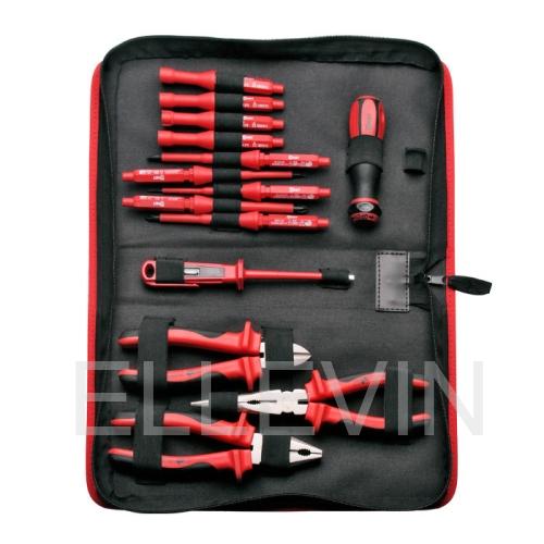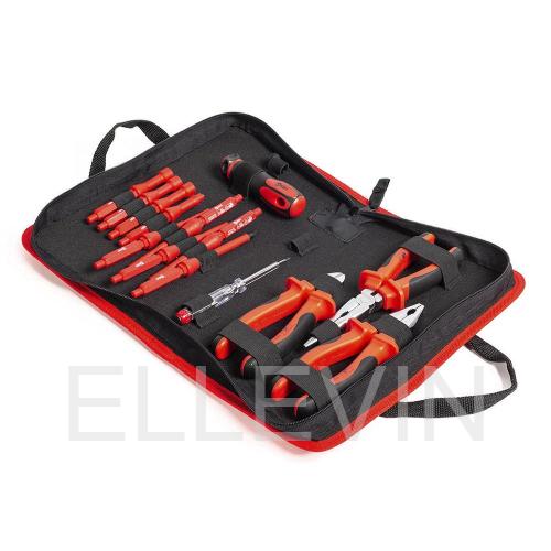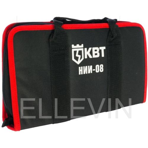 Набор изолированного инструмента КВТ НИИ-08 включает 15 предметов и предназначен для выполнения профессиональных электромонтажных работ. Туда входят бокорезы, пассатижи, длинногубцы, сменные отвертки, тестер для проверки напряжения в сети, ключи для электрошкафов, рукоятка для сменных отверток, способные работать под напряжением 1000 В. Набор поставляется в тканевом кофре на молнии и с ручками.