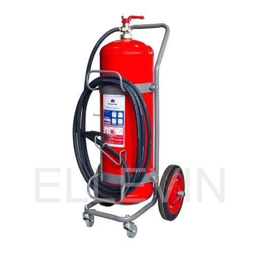 Передвижной огнетушитель состоит из корпуса, заполненного огнетушащим веществом (ОТВ) и заряженного сжатым азотом до давления 1,85±3% МПа и запорно-пускового устройства. Запорно-пусковое устройство оснащено рычагами управления, индикатором давления, шлангом с распылительным соплом, предназначенным для подачи распыленной струи ОТВ в зону очага возгорания.