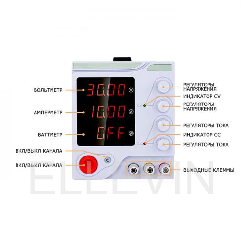 В данной модели максимальное напряжение составляет 30 вольт, максимальное значение тока 10 ампер.