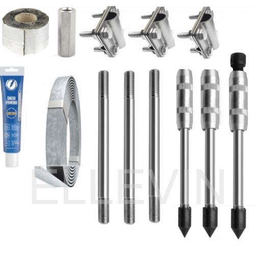 Заземляющие устройства изготовлены из оцинкованной стали марки ст.35 (или ст.20) с покрытием цинком по ГОСТ 9.301-86 / ГОСТ 9.307-2021. Минимальное рекомендуемое расстояние от фундамента - не менее 1 метра.