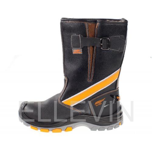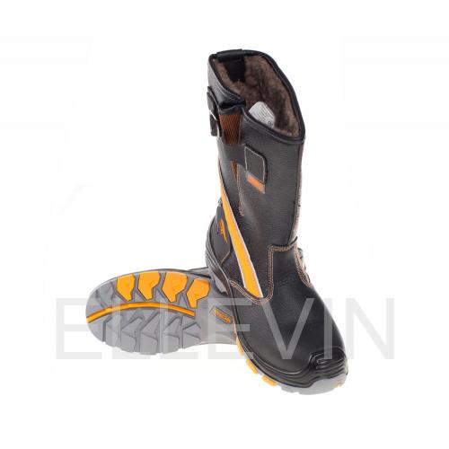 Верхняя часть обуви выполнена из термоустойчивой и водоотталкивающей кожи (юфти) толщиной от 1,8 до 2,0 мм. Подошва – двухслойная, устойчивая к воздействию нефти, нефтепродуктов, щелочей концентрации до 20%, повышенных температур. Голенище выполнено из искусственной кожи. Верхний слой из полиуретана обладает амортизирующими свойствами, гасит ударные нагрузки, а также придает обуви легкость, комфортность и повышенные теплозащитные свойства. Ходовой слой изготовлен из износостойкой, термостойкой (+300°С / 60 с), морозостойкой резины на основе нитрильного каучука с улучшенным сопротивлением скольжению, стойкостью к деформациям, истиранию. Носочная часть имеет дополнительную защиту в виде полиуретановой накладки, предотвращающей механические повреждения обуви и препятствующей проникновению холода. Для защиты от ударов в носочной части стопы в обуви применяется композитный подносок (Мун 200), имеющий конфигурацию, препятствующую надавливанию верхнего края на стопу, и оборудованный прокладкой из полиуретана. ПОДНОСОК: Укрепленный, поликарбонатный ПОДОШВА: Литьевой метод крепления, двухслойная, полиуретан /резина на основе натурального каучука (ПУ-Резина).