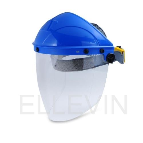 Экран сферической формы с панорамным обзором из ударопрочного и термостойкого поликарбоната толщиной 2 мм со скошенной книзу формой для увеличения эргономики изделия. Синий козырек увеличенного размера из ударопрочного и термостойкого материала имеет специальную площадку для нанесения логотипа.