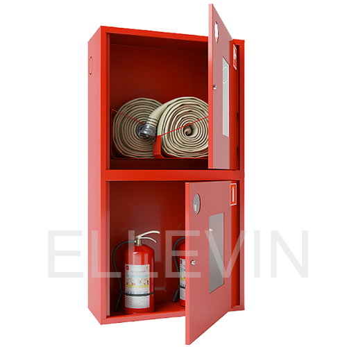 Состоит из двух вертикально ориентированных секций и служит местом хранения таких первичных средств пожаротушения, как огнетушители и комплекты пожарного крана (ПК). Изделие выполнено из листовой стали методом сварки и покрашено особой порошковой краской красного цвета. Для подведения противопожарного водопровода и монтажа на него пожарного крана (ПК) боковые стенки шкафа имеют перфорированные отверстия. Габариты секции для огнетушителей 700х650х300.