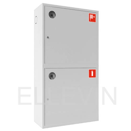 Состоит из двух вертикально ориентированных секций и служит местом хранения таких первичных средств пожаротушения, как огнетушители и комплекты пожарного крана (ПК). Изделие выполнено из листовой стали методом сварки и покрашено особой порошковой краской белого цвета. Для подведения противопожарного водопровода и монтажа на него пожарного крана (ПК) боковые стенки шкафа имеют перфорированные отверстия. Габариты секции для огнетушителей 700х650х300.