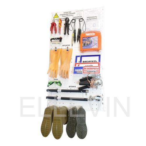 Стенд ELMA107 для хранения СИЗ настенный металлический предназначен для создания условий хранения средств индивидуальной защиты, применяемых в электроустановках, в соответствии с требованиями инструкции СО 153-34.03.603-2003 по применению и испытанию.