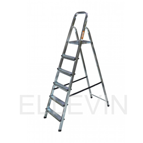 Прочный корпус изготовлен из стали. Покрыта гальваническим антикоррозийным покрытием. Односекционная модель с 5-ю широкими ступенями с рифленой поверхностью и рабочей площадкой. Чтобы стремянка не скользила, на опорах оборудованы заглушки. Также есть дуга безопасности. В сложенном состоянии модель очень компактна и занимает мало места.