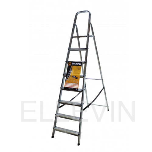 Прочный корпус изготовлен из стали. Покрыта гальваническим антикоррозийным покрытием. Односекционная модель с 7-ю широкими ступенями с рифленой поверхностью и рабочей площадкой. Чтобы стремянка не скользила, на опорах оборудованы заглушки. Также есть дуга безопасности. В сложенном состоянии модель очень компактна и занимает мало места.