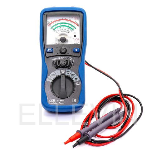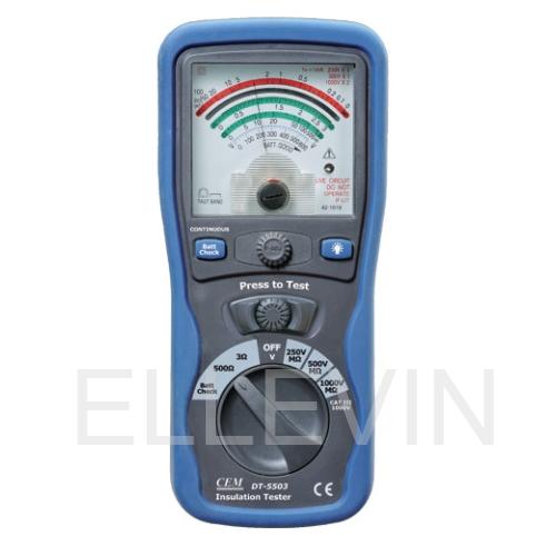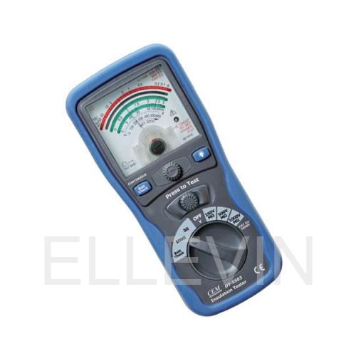 DT-5503 Аналоговый тестер является компактным и простым в использовании прибором. Прибор имеет три диапазона проверки изоляции: 250 В, 500 В и 1000 В, диапазон электропроводимости 3 Ом и диапазон сопротивления 500 Ом. Этот прибор оснащен звуковым предупреждением и отображает фактическое напряжение переменного тока в электрической сети.