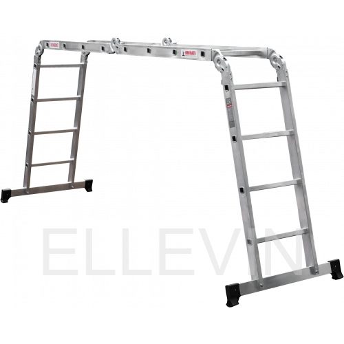 Многофункциональная улучшенная шарнирная лестница «4 в 1» увеличенной шириной для бытового использования с повышенными нагрузками: приставная, Г-образная с опорой на стену, двухсторонняя стремянка, помост.