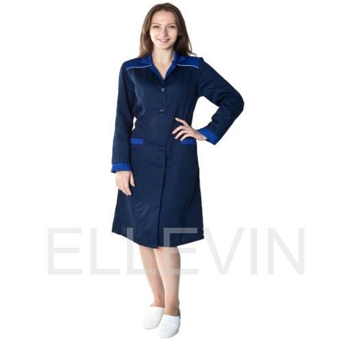 По спинке и полочкам - отрезная кокетка отделочного цвета со светоотражающим кантом. Воротник- отложной. Рукава втачные с манжетами на петле/пуговице . Боковые карманы - накладные , с отделкой контрастного цвета и светоотражающим кантом . Ширина спинки по талии регулируется втачными в боковые швы халата полупоясами на пуговицах .
