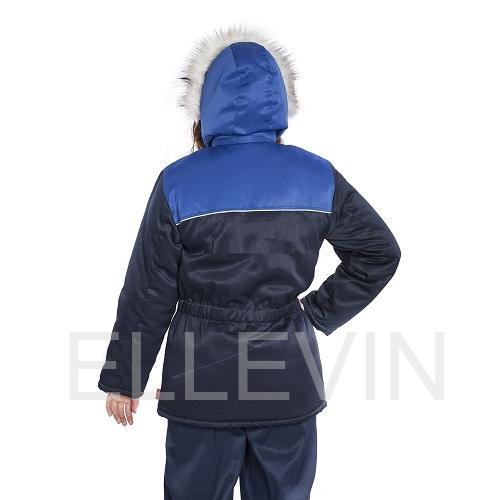 Куртка удлиненная, с рельефами на полочках. Центральная застежка на молнию, закрытую ветрозащитным клапаном на «липучках». Воротник - стойка, внутри выполнен из флиса. Боковые карманы - внутренние, на молнии. Рукава -втачные, внутри имеют трикотажные напульсники. По кокеткам спинки и полочек втачан светоотражающий кант. Ширина по линии талии регулируется резинкой. Утепленный капюшон пристегивается при помощи молнии и отделан по лицевому вырезу искусственным мехом.