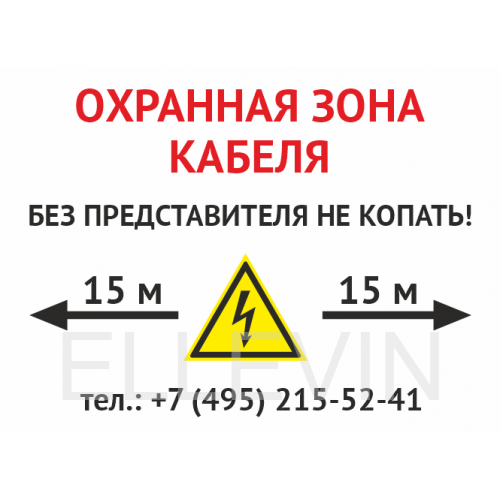 Знак «Охранная зона кабеля. Без представителей не копать», OZK-02 на 2-мм пластике, размером 400х300 мм устанавливается для обозначения зоны залегания кабеля в местах его пересечения с автомобильной дорогой и другими коммуникациями. Знак должен быть установлен на определенном расстоянии от земли – на высоте человеческого роста (1,7 м). На нем обязательно размещение таких данных, как адрес и телефон эксплуатирующего линию предприятия, размеры охранной зоны