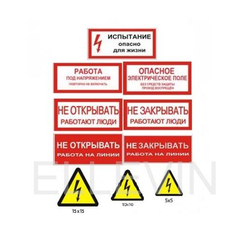 Комплект плакатов №2 (9шт). (Ламинированный картон) 1.Испытание опасно для жизни Для предупреждения об опасности поражения электрическим током при проведении испытаний c повышенным напряжением 300 х 150 мм 2.Работа под напряжением повторно не включать Для запрещения повторного ручного включения выключателей ВЛ после их автоматического отключения без согласования с производителем работ 200 х 100 мм 3.Опасное электрическое поле без средств защиты проход воспрещён Для предупреждения об опасности воздействия электрического поля на персонал и запрещения передвижения без средств защиты 200 х 100 мм 4.Не открывать работают люди Для запрещения подачи сжатого воздуха, газа 200 х 100 мм 5.Не закрывать работают люди 200 х 100 мм 6.Не открывать работа на линии 200 х 100 мм 7.Не закрывать работа на линии 200 х 100 мм 8.Молния Для предупреждения об опасности поражения электрическим током 50 х 50 х 50 мм 9.Молния Для предупреждения об опасности поражения электрическим током 100 х 100 х 100 мм