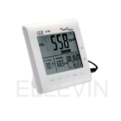 Измеритель DT-802 предназначен для контроля качества воздуха, в том числе отделами охраны здоровья, путем измерения уровня концентрации СО2 в воздухе, например, на предприятиях, в школах, офисах, на транспортных магистралях и т.д. Измеренное значение выражается в ppm (частиц на млн.) и отображается на ЖК-экране прибора с сопровождающим индикатором качества воздуха: Нормальный (0-800 ppm), Удовлетворительный (800-1200 ppm), Загрязненный (свыше 1200 ppm). В случае превышения допустимой нормы содержания СО2 прибор выдает звуковой сигнал.
