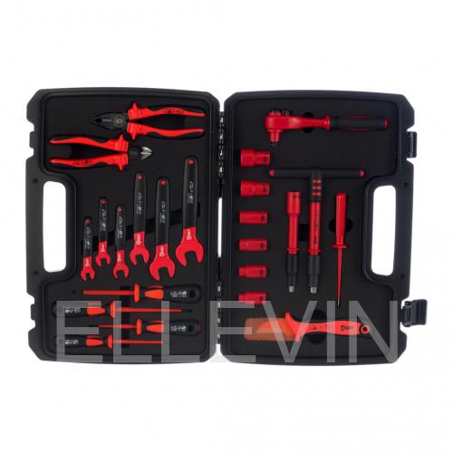 1) диэлектр. трещоточный ключ 200 мм 2) диэлектр. Т-образная рукоятка 200 мм 3) диэлектр. удлинитель 150 мм 4) диэлектр. шестигранная головка 3/8’’ – 8 мм 5) диэлектр. шестигранная головка 3/8’’ – 10 мм 6) диэлектр. шестигранная головка 3/8’’ – 12 мм 7) диэлектр. шестигранная головка 3/8’’ – 13 мм 8) диэлектр. шестигранная головка 3/8’’ – 17 мм 9) диэлектр. шестигранная головка 3/8’’ – 19 мм 10) диэлектр. однорожковый ключ 8 мм 11) диэлектр. однорожковый ключ 10 мм 12) диэлектр. однорожковый ключ 12 мм 13) диэлектр. однорожковый ключ 13 мм 14) диэлектр. однорожковый ключ 17 мм 15) диэлектр. однорожковый ключ 19 мм 16) диэлектр. нож монтерский НМИ-05 17) диэлектр. пассатижи 180 мм 18) диэлектр. бокорезы 160 мм 19) диэлектр. отвертка: шлиц 4х100 20) диэлектр. отвертка: шлиц 5.5х125 21) диэлектр. отвертка: PH1x80 22) диэлектр. отвертка: PH2x100 23) отвертка-индикатор