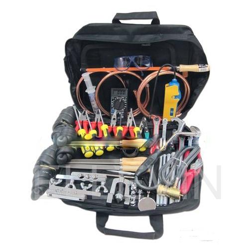 Набор инструментов НИР-ХК-01 включает: плоскогубцы, кусачки, длинногубцы, ключи вентильные, набор отверток, напильники, ножовку по металлу, ножницы для резки капиллярной трубы, горелку со шлангом, труборез, трубогиб, набор вальцовок, зеркало, течеискатель фреона, риммер, герметик.