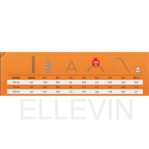 Среди особенностей модели можно выделить ступени с рифлением для безопасного подъема и спуска, стойки и ступени из прессованного алюминиевого профиля. Стойки с дополнительным усилием в наиболее нагруженных местах для повышения жесткости. Многократная развальцовка в соединении ступеней со стойками обеспечивает высокую прочность и долговечность. Шарнирные замки регулируются одной рукой. Широкие поперечные траверсы обеспечивают высокую устойчивость при работе во всех положениях. Башмаки траверсы препятствуют скольжению и надежно закреплены с помощью заклепок. Максимальная нагрузка в положении помост 100 кг.